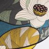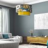 Il paralume interno ha il compito di diffondere ed ammorbidire l’illuminazione ed è realizzato in tessuto sintetico giallo acido su diffusore in pvc bianco. La trama risulta liscia ed uniforme e la tonalità del giallo acido tende a “scaldarsi” in accensione diventando più accogliente. Il paralume esterno è in cotone stampato con motivo floreale con fondo blu petrolio su pvc semitrasparente. Il contrasto tra i due cilindri è armonizzato dalla rifinitura nera che unisce visivamente tutti gli elementi.