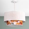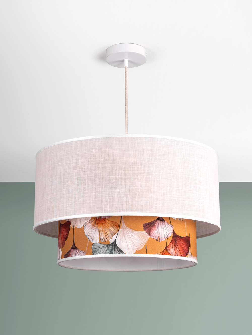 Il paralume interno ha il compito di diffondere ed ammorbidire l’illuminazione ed è realizzato in tessuto sintetico giallo acido su diffusore in pvc bianco. La trama risulta liscia ed uniforme e la tonalità del giallo acido tende a “scaldarsi” in accensione diventando più accogliente. Il paralume esterno è in cotone stampato con motivo floreale con fondo blu petrolio su pvc semitrasparente. Il contrasto tra i due cilindri è armonizzato dalla rifinitura nera che unisce visivamente tutti gli elementi.