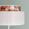 Il paralume è realizzato in misto di lino leggero avorio nella parte esterna su pvc semitrasparente e cotone 100% stampato con fondo ocra-arancio e foglie di ginkgo di vari colori su pvc bianco nella parte interna. Le rifiniture del paralume in bianco panna creano continuità tra i due cilindri e la piantana.