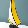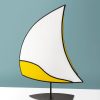 Una lampada insolita che unisce particolarità ed eleganza. Il tessuto bianco trasmette leggerezza ed in accensione la trama ricorda il movimento delle onde, l’inserto giallo acido crea ulteriore movimento e si ripete anche nel lato destro della vela.